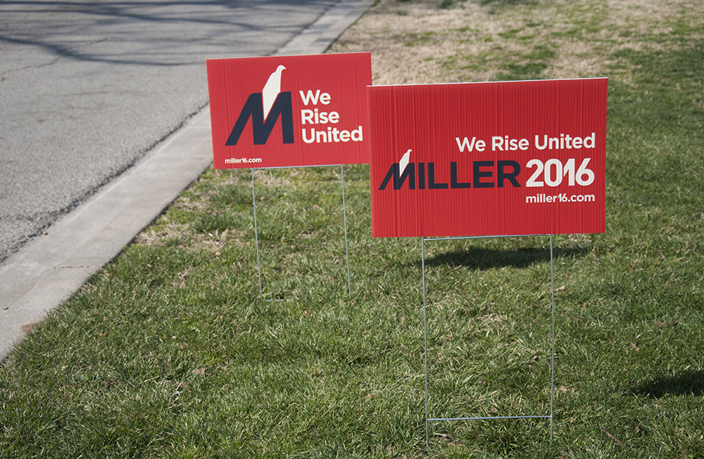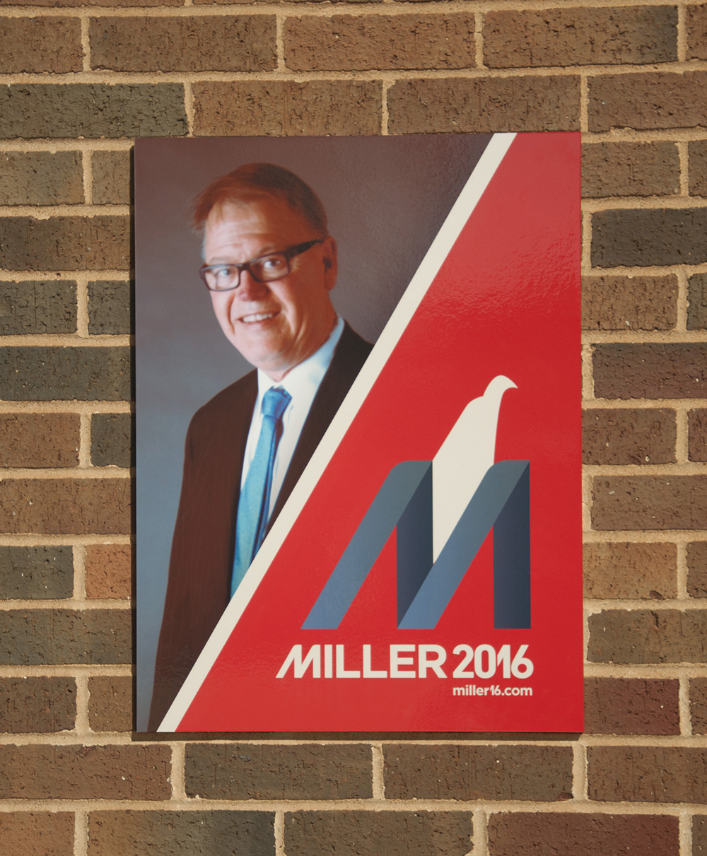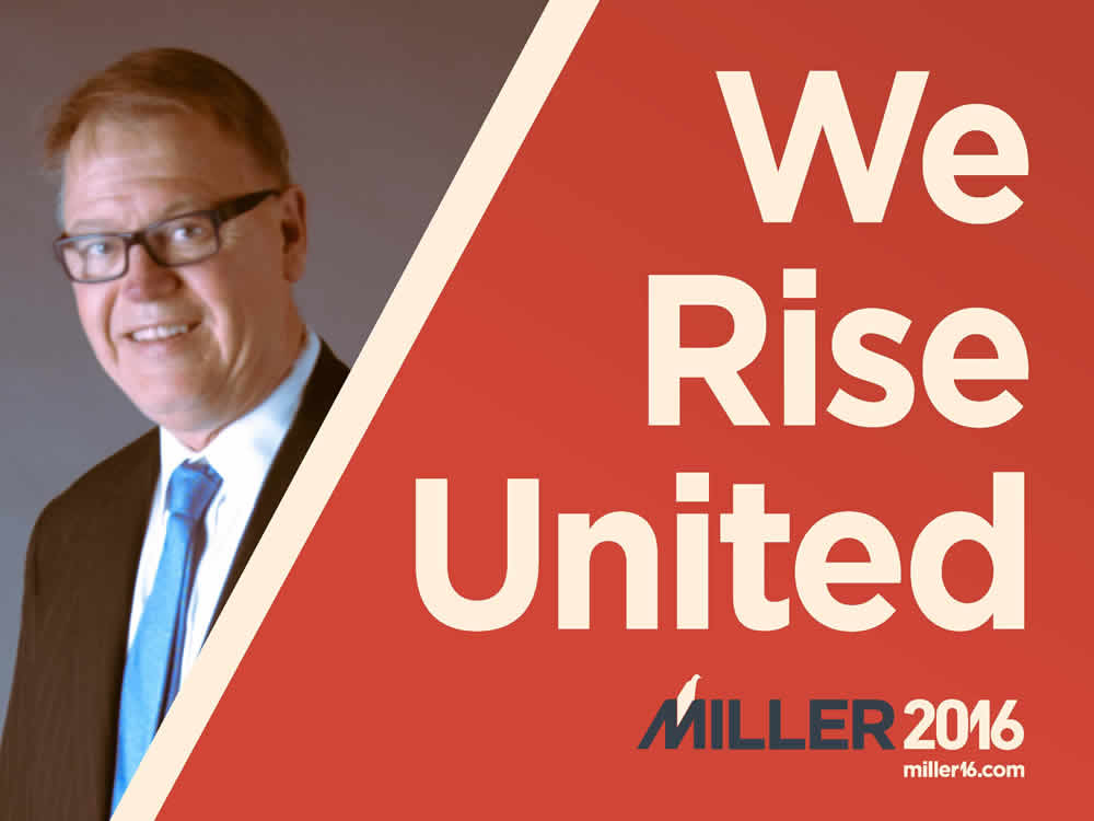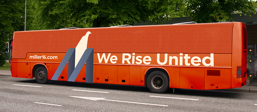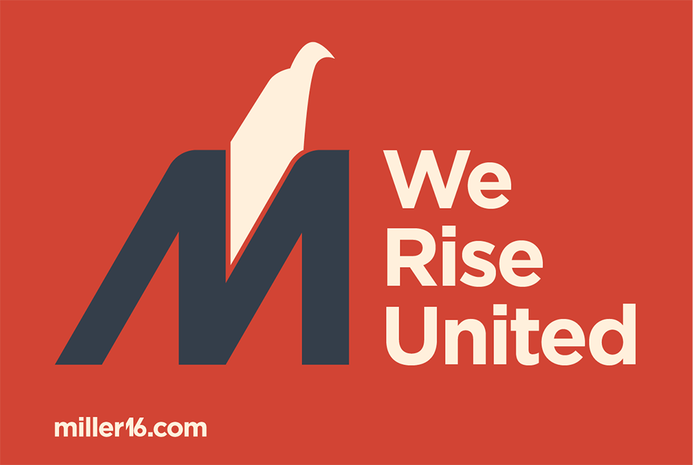 For the mark, I wanted to evoke America with an abstracted eagle soaring into the sky. This reinforces the slogan of, “We Rise United.” The ribbon forming the M reminds the viewer subtly of the stripes on the flag and of patriotic bunting. The M also serves to form the body of the eagle. The colors in the mark are muted, showing that Mike Miller is not a flashy candidate, but rather someone willing to work for America. The font is a clean, bold, sans serif, showing that Mike Miller is ready to change things for the better through bold ideas. The slogan reminds the public that Mike Miller wants to work with a bipartisan approach to governing.