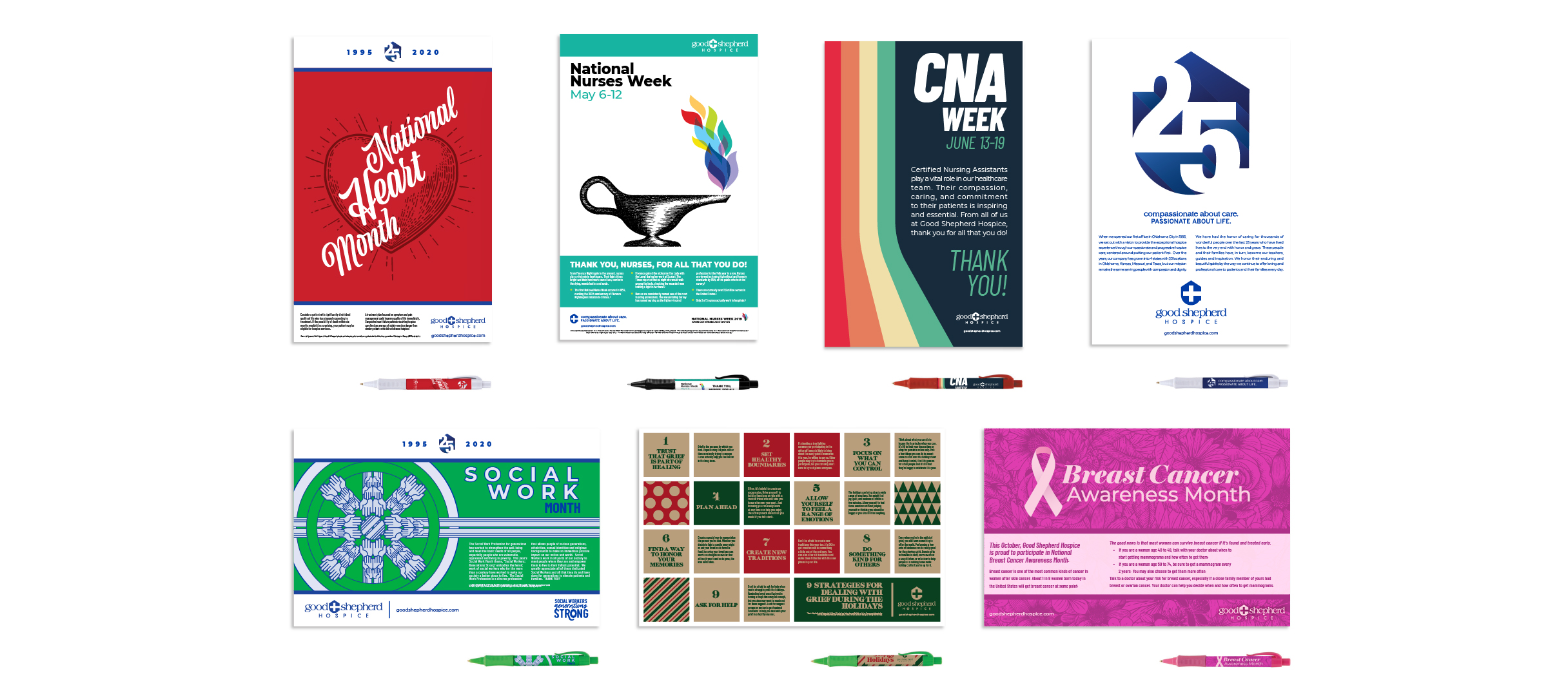 When I joined Good Shepherd Hospice, I inherited a program in which a new pen design was created around a different theme each month. These pens would occasionally be accompanied with a poster designed to provide more information on the monthly theme. People in our health care communities really love these pens and look forward to each month’s design. This program has given me a platform to be more experimental in my designs, freeing me from sticking to the white daisy and blue and yellow color scheme. It has been a nice outlet for my creativity personally. Much more importantly, these monthly campaigns serve as important sales tools for our Hospice Consultants communicating with physicians and hospitalists about the ways we can serve their patients with compassion and dignity as they near the end of their lives.